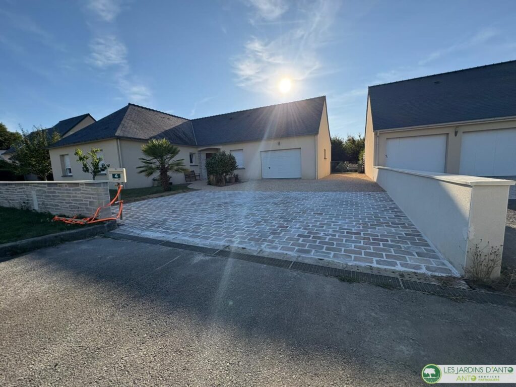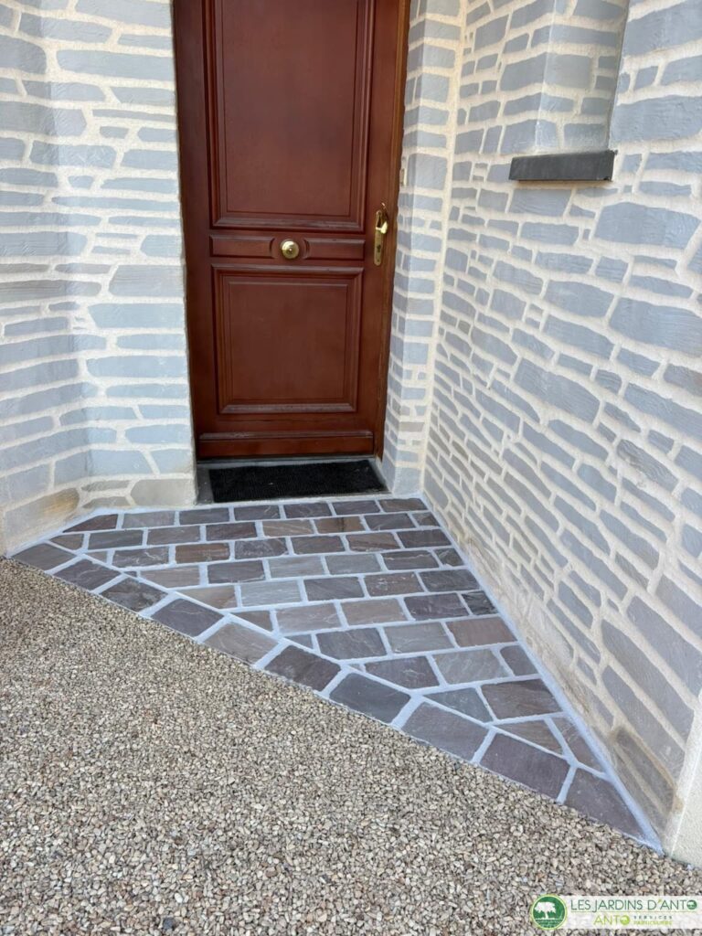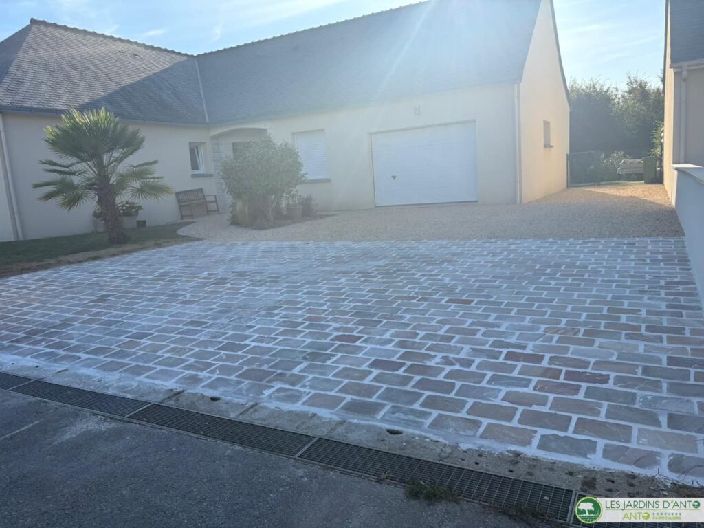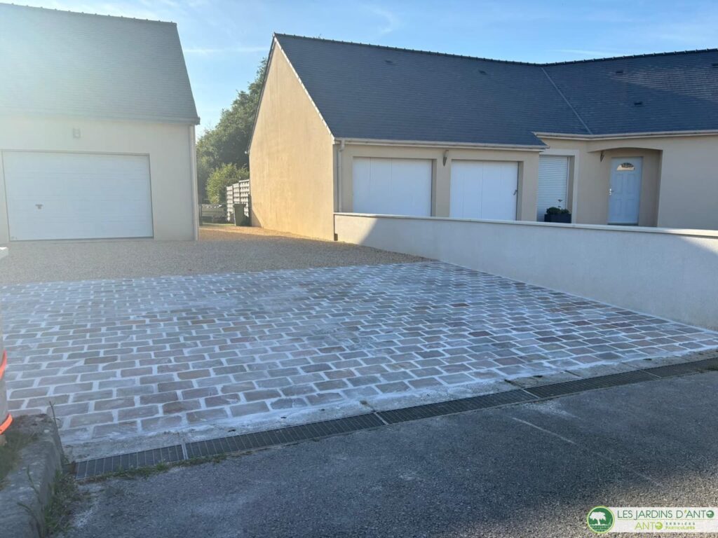 – Pavage en pavés de grès Métissay devant le garage et l’entrée,